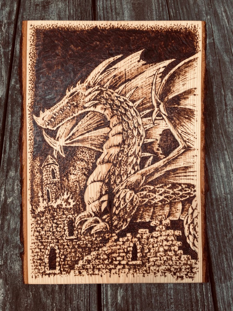 This is my latest Woodburning, entitled Ancient Dragon . Would you like your own hand made Woodburning of this design? For a limited time, I’m offering this design for $96. That’s 20% off the retail price of $120. You get a 9” X 12” live edge piece of basswood with the design shown hand burned onto it. Because I work freehand, yours wont be an exact match of the one shown. However, I guarantee it will be just as good, if not better, and that you will be completely satisfied with the artwork, or your money back. If you are interested, just e-mail me at jaytref@gmail.com, the the words Ancient Dragon in the title, and I will send you a PayPal invoice. Thanks for checking out my artwork.