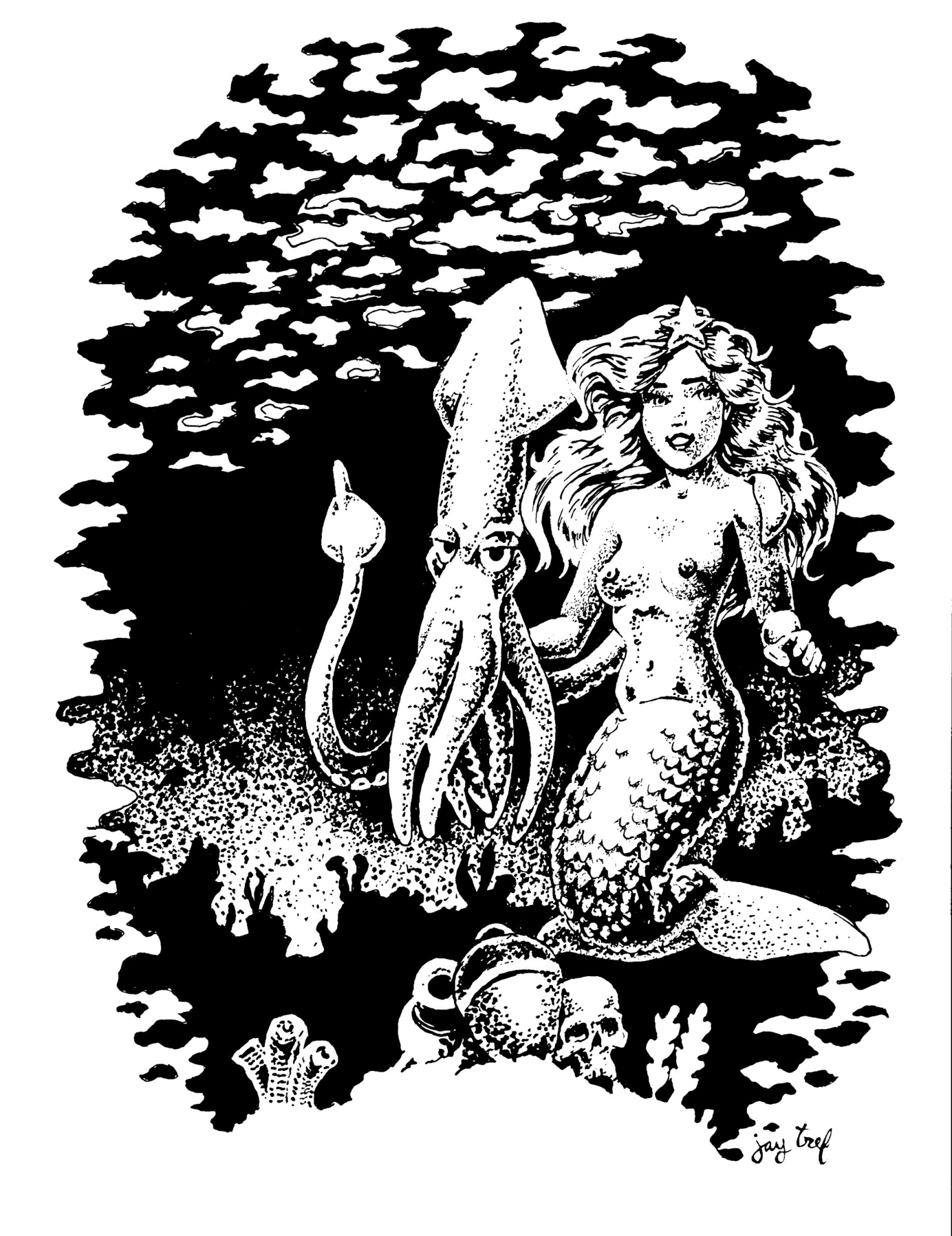 Mermaid drawing by Jay Trefethen, featuring a mermaid and a rude squid